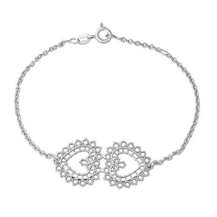 Kotimainen Lempikoru Pitsisydän -rannekoru on kaunis ja romanttinen koru. Rannekorun keskellä on kaksi herkkää pitsisydäntä, jotka on sommiteltu kauniisti vastakkain. Koruosan koko on 34 x 18 mm ja ketju on kätevästi säädettävissä pituuksiin 17/19 cm. Koru on valmistettu laadukkaasta 925 sterling-hopeasta.