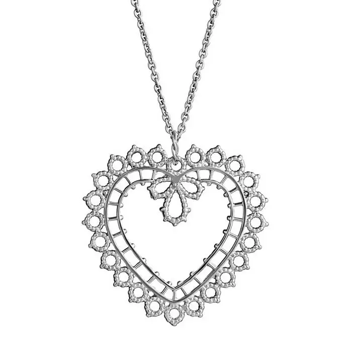 Kotimainen Lempikoru Pitsisydän -kaulakoru on upea, romanttinen koru. Tämän suuren riipuksen herkkä ja yksityiskohtainen kuviointi tuo mieleen perinteisen pitsin, luoden ajattoman ja koristeellisen ilmeen. Näyttävän riipuksen koko on 40 x 41 mm, ja siihen on valittavissa ketju kahdesta pituudesta: säädettävä 45/50 cm tai pidempi 60 cm. Koru on valmistettu laadukkaasta 925 sterling-hopeasta.