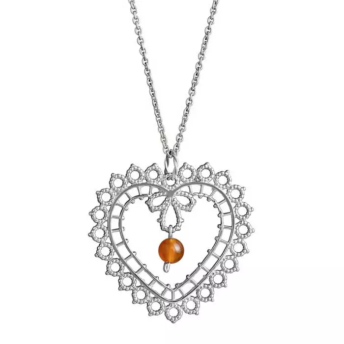 Kotimainen Lempikoru Pitsisydän -kaulakoru on upea, romanttinen koru. Tämän suuren riipuksen herkkää ja yksityiskohtaista pitsikuviota korostaa sydämen keskeltä kauniisti riippuva, syvänpunainen kristallihelmi, joka tuo koruun upean väripilkahduksen. Näyttävän riipuksen koko on 40 x 41 mm, ja siihen on valittavissa ketju kahdesta pituudesta: säädettävä 45/50 cm tai pidempi 60 cm. Koru on valmistettu laadukkaasta 925 sterling-hopeasta.