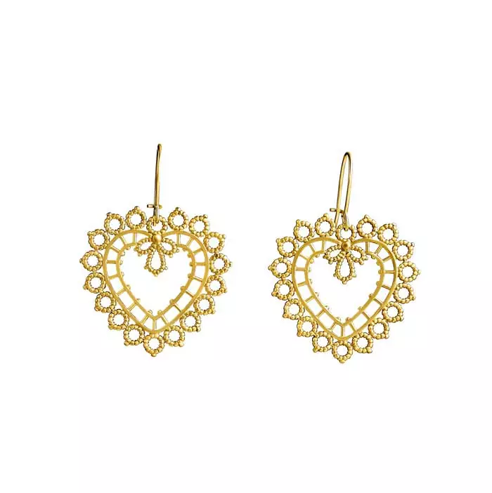 Kotimaiset Lempikoru Pitsisydän -korvakorut ovat näyttävät ja romanttiset roikkuvat korvakorut. Niiden herkkä ja yksityiskohtainen kuviointi tuo mieleen perinteisen pitsin, ja lämmin keltakullattu sävy korostaa korun koristeellisuutta. Koruosan koko on 30 x 30 mm ja korvakoruissa on perinteinen koukkukiinnitys. Korut on valmistettu laadukkaasta, keltakullatusta 925 sterling-hopeasta.