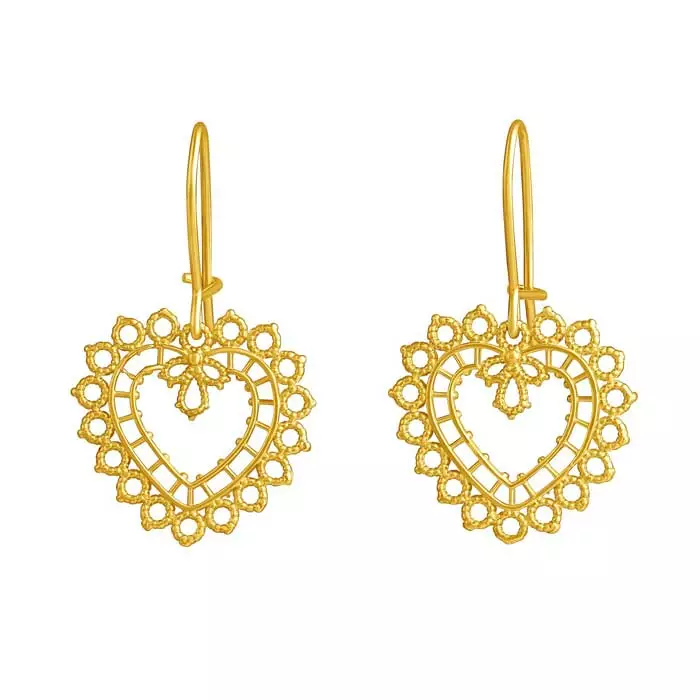 Kotimaiset Lempikoru Pitsisydän -korvakorut ovat sirot ja romanttiset roikkuvat korvakorut. Niiden herkkä ja yksityiskohtainen kuviointi tuo mieleen perinteisen pitsin, ja lämmin keltakullattu sävy korostaa korun koristeellisuutta. Koruosan koko on 17 x 18 mm ja korvakoruissa on perinteinen koukkukiinnitys. Korut on valmistettu laadukkaasta, keltakullatusta 925 sterling-hopeasta.