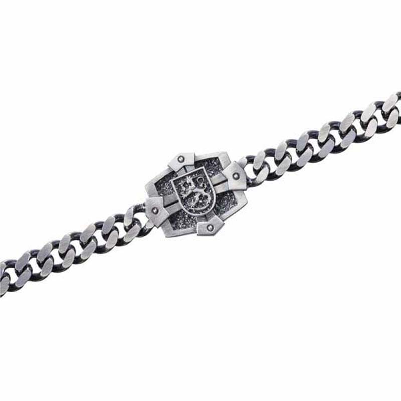 Kotimainen miesten hopeinen rannekoru. Tummennetun hopearannekorun keskellä on Suomen leijona. Tämän miesten käsikorun valmistusmateriaali on laadukas 925 hopea. Rannekorun koruosan koko on 19 x 23 mm. Rannekorun ketjun pituus on 21 cm.