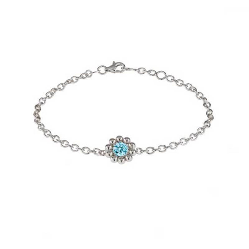 Daisy naisten hopeinen rannekoru on valmistettu 93 prosenttisesti kierrätetystä hopeasta. Sirossa rannekorussa on säädettävä pituus 18/19,5 cm. Rannekorua koristaa kukkaa muistuttava koruosa, jossa on koristeena raikas sininen zirkoniakivi. Daisy-sarjan korut sopivat erinomaisesti rippi- tai valmistujaislahjaksi nuorelle, mutta myös kaikenikäisille sirojen korujen ystäville. Yhdistele rannekoru samaan sarjaan kuuluvien riipuksen, korvakorujen ja sormuksen kanssa luodaksesi kauniin kokonaisuuden!