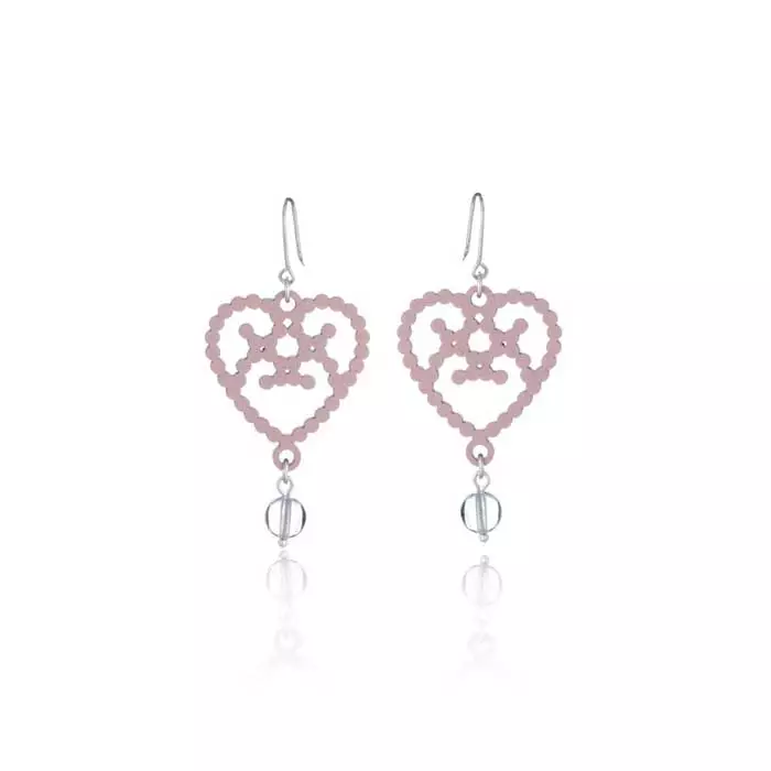 Näyttävät ja kevyet naisten puiset korvakorut. Pinkit Helmi-puukorvakorut ihastuttavat koristeellisuudellaan. Korvakorun koko on 30 x 47 mm. Korvakoruissa on koukkukiinnitys.