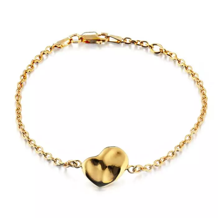 Kotimainen naisten kullattu hopeinen rannekoru. Laadukkaasta 925 sterling-hopeasta valmistetun ja keltakullalla pinnoitetun riipuksen kiiltävänä loistava pinta on muovautunut sulaneen sydämen muotoon. Koruosan leveys on 17 mm ja pituus 15 mm. Ranneketju on kätevästi säädettävissä pituuksiin 18 cm ja 19,5 cm.