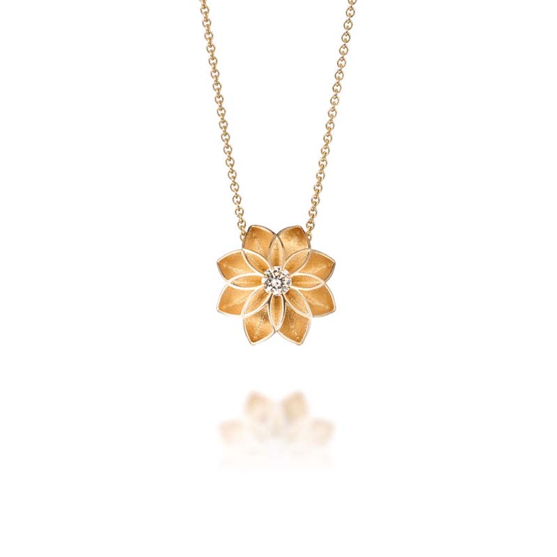 Kotimainen naisten kultainen kaulakoru timantilla. Kultariipus kuvaa kaunista, vaaleaa kukkaa, ja sen keskellä säihkyy timantti. Timantin paino on 0,15 ct. Näyttävä kukkariipus riippuu kauniisti kaulalla kultaketjussaan, jonka pituus on 45 cm. Riipuksen koko on 14 x 14 mm. Upea kaulakoru ilahduttamaan arjessa tai säväyttämään juhlassa!