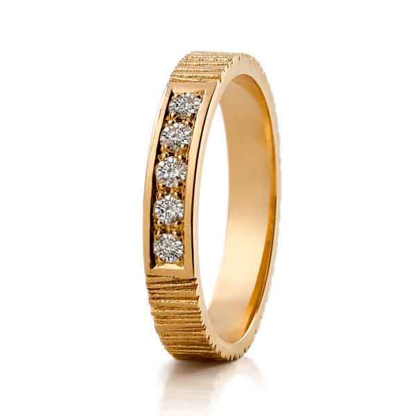 Kotimainen Lumoava Raita timanttisormus. Sormukseen on istutettu viisi timanttia riviin ja niiden yhteispaino on 0,15 ct. Sormuksen runko on kuvioitu tyylikkäillä raidoilla. Sormuksen rungon leveys on 3,5 mm ja valmistusmateriaali 14 karaatin keltakulta.