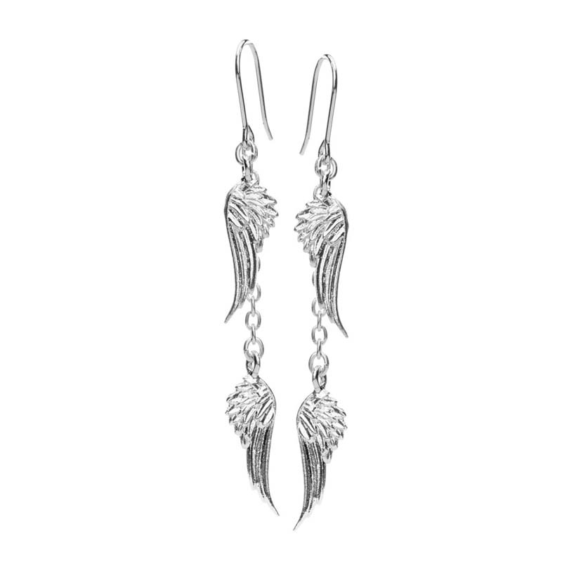 Näissä hopeisissa roikkuvissa korvakoruissa riippuvat kauniit ja sirot siivet. Korvakorujen valmistusmateriaalina on laadukas 925 hopea. Koukkukorvakorujen koko on 8 x 53 mm.