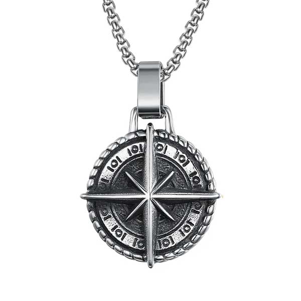 Teräksinen miesten kaulakoru tyylikkäällä kompassi-riipuksella. Kompassiriipus on leveydeltään noin 28 mm ja sen korkeus riipuslenkin kanssa on noin 40 mm. Teräsketjun pituus on valittavissa, joko 50 cm tai 60 cm. Ketjun paksuus on noin 2 mm. Valmistusmateriaali on kestävä ja laadukas 316L ruostumaton teräs eli kirurginteräs.