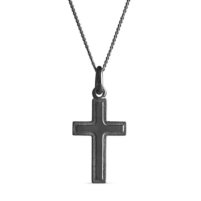 Hopeinen musta ristiriipus mattapintaisella reunalla. Hopearistin korkeus on 23 mm ja leveys on 13 mm. Hopearistin ketju on kätevästi säädettävissä pituuksiin 45 cm ja 50 cm. Materiaali on laadukas 925 sterling-hopea, joka on tummennettu.