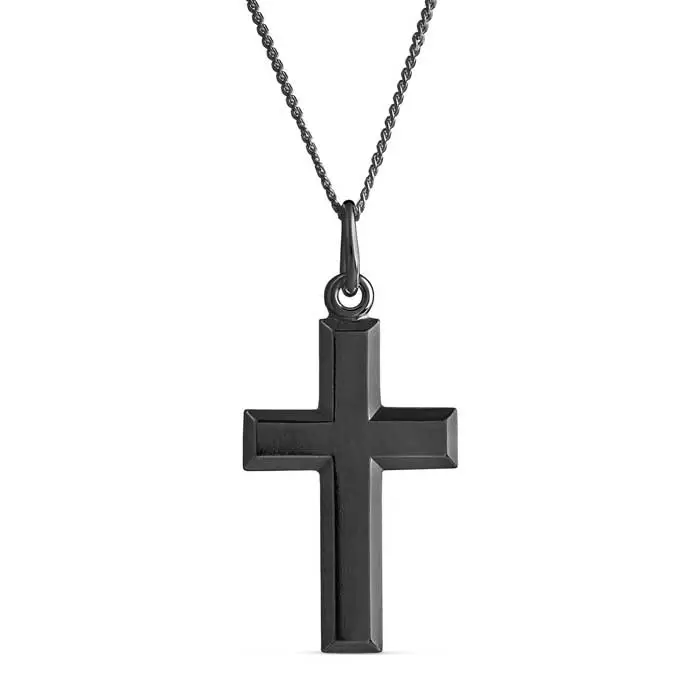 Klassisen pelkistetty iso musta ristiriipus. Hopearistin korkeus on 27 mm ja leveys on 15 mm. Hopearistin ketju on kätevästi säädettävissä pituuksiin 45 cm ja 50 cm. Materiaali on laadukas 925 sterling-hopea, joka on tummennettu.