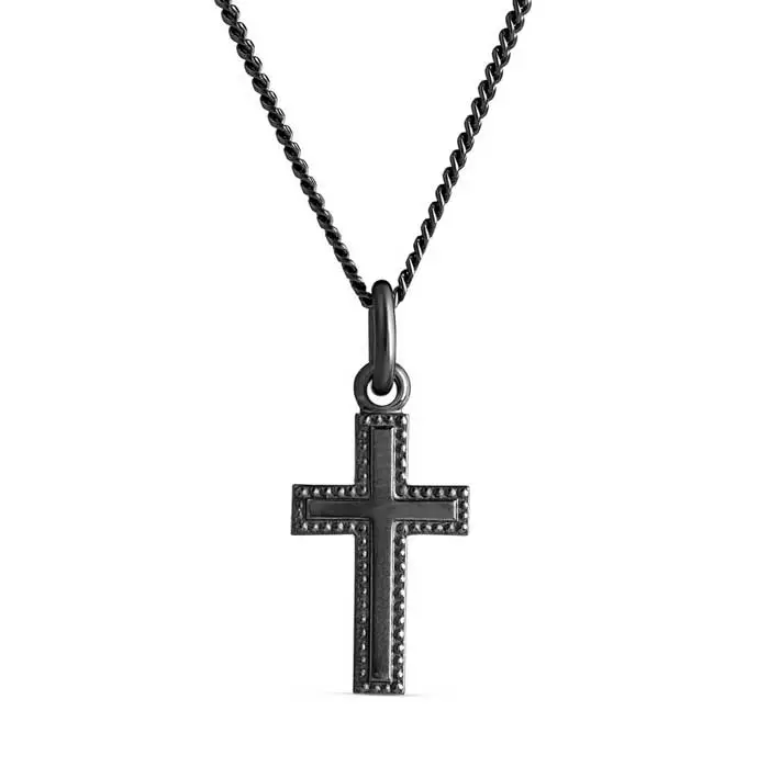 Musta hopeinen ristiriipus koristeellisella reunakuvioinnilla. Hopearistin korkeus on 19 mm ja leveys on 10 mm. Hopearistin ketju on kätevästi säädettävissä pituuksiin 45 cm ja 50 cm. Materiaali on laadukas 925 sterling-hopea, joka on tummennettu.