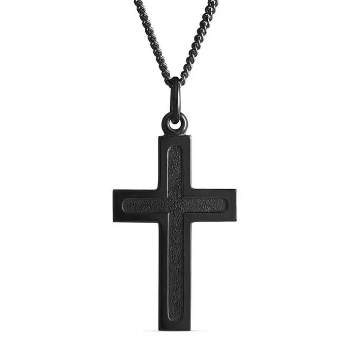 Musta hopeinen ristiriipus pelkistetyllä kuvioinnilla. Kookkaan hopearistin korkeus on 32 mm ja leveys on 18 mm. Hopearistin ketju on kätevästi säädettävissä pituuksiin 45 cm ja 50 cm. Materiaali on laadukas 925 sterling-hopea, joka on tummennettu.