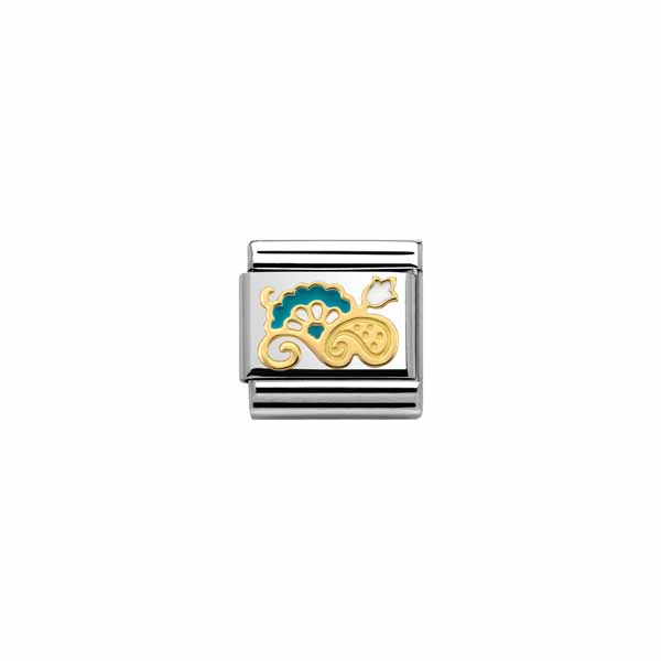 Nomination Classic Gold sarjan kukkakimppu-pala. Kultaisesta kukkakimpusta löytyvät valkoinen ja siniset yksityiskohdat. Koruosa on 18 karaatin keltakultaa. Kaunis pala koristamaan Nomination-ranneketta!