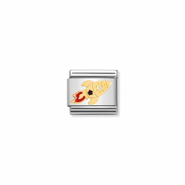 Nomination Classic Gold sarjan raketti-pala. Raketissa on koristeena tähti ja lieska takana. Koruosa on 18 karaatin keltakultaa. Tämä pala sopii avaruudesta ja raketeista kiinnostuneille tai symboloimaan nousukiitoa!