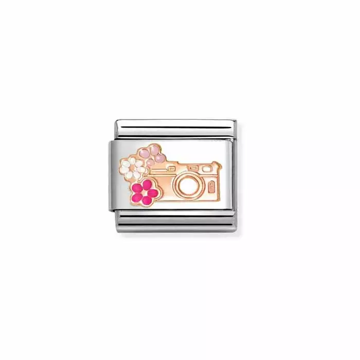 Nomination Classic rose gold sarjan kamera-pala kukkasilla. Koruosa on 9 karaatin ruusukultaa. Tämä pala sopii esimerkiksi lahjaksi valokuvaamista harrastavalle!