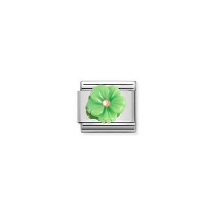 Nomination Classic rose gold sarjan vihreä kukka -pala. Palaa koristaa kaunis vaaleanvihreä kukka. Koruosa on 9 karaatin ruusukultaa. Tämä kukka-pala sopii niin kukkien kuin vihreän värinkin ystävälle!