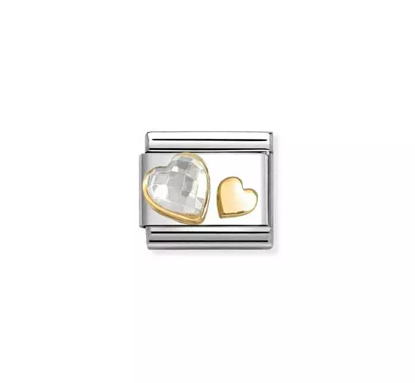 Nomination Classic Gold sarjan sydän-pala vaalealla zirkonia-korukivellä. Koruosa on 18 karaatin keltakultaa. Tämä kaunis pala sopii koristamaan monenlaista Nomination-ranneketta!