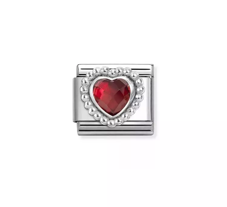 Nomination Classic Silvershine sarjan kaunis pala sydämen muotoisella punaisella korukivellä. Sydämen muotoisen kiven koristeellinen reunustus on 925 sterling-hopeaa. Klassinen sydän sopii koristamaan monenlaista Nomination-ranneketta!