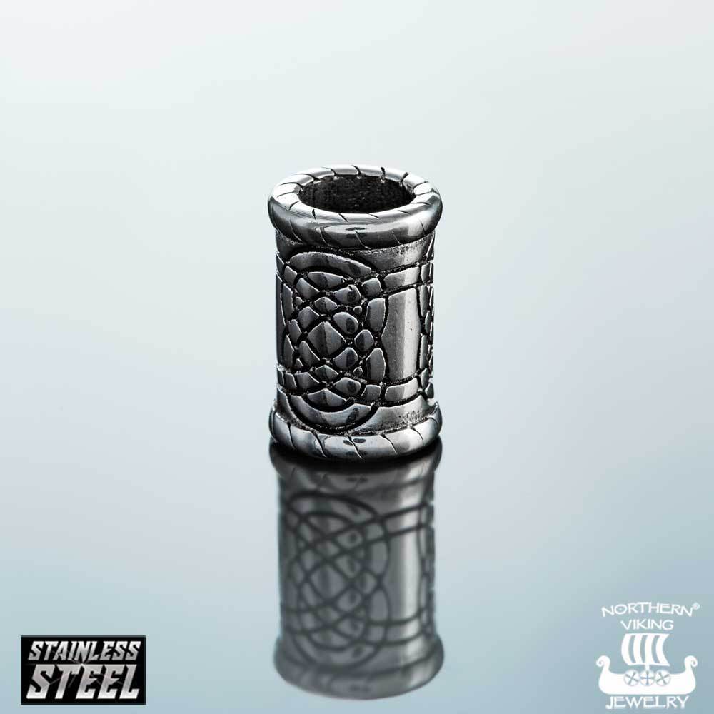 Teräksinen partakoru solmukuvioinnilla. Partakorun leveys on 1,2 cm ja korkeus 1,4 cm. Reiän halkaisija on 0,8 cm. Valmistusmateriaali on kestävä kirurginteräs. Partakorun mukana toimitetaan 2 kpl silikonikuminauhoja. Kuminauhalla voit päättää parran letityksen tai käyttää kuminauhaa partakorun alla luomaan kitkaa jolloin koru pysyy paremmin paikoillaan.
