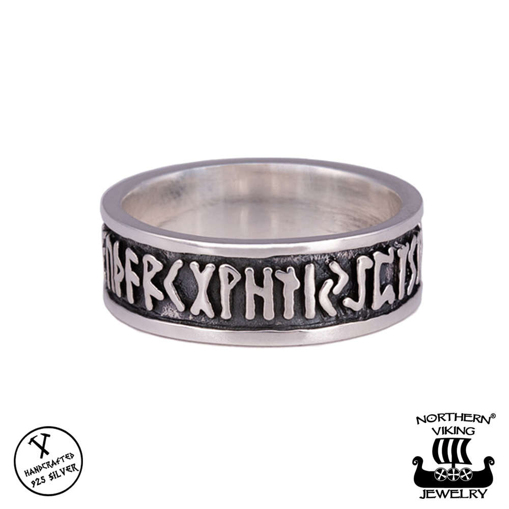 Northern Viking Jewelry hopeinen Viking Rune-sormus. Sormuksen ympärillä on riimukirjoitus. Sormuksen leveys on 8 mm. Valmistusmateriaali on laadukas 925 sterling-hopea.