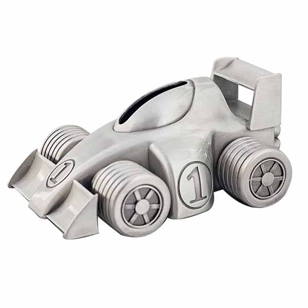 Hauska säästölipas, vauhdikas formula-auto. Metallisen säästöpankin korkeus on noin 5,5 cm ja pituus noin 11,5 cm. Formula-auto-säästöpossu on myös hieno koriste-esine.