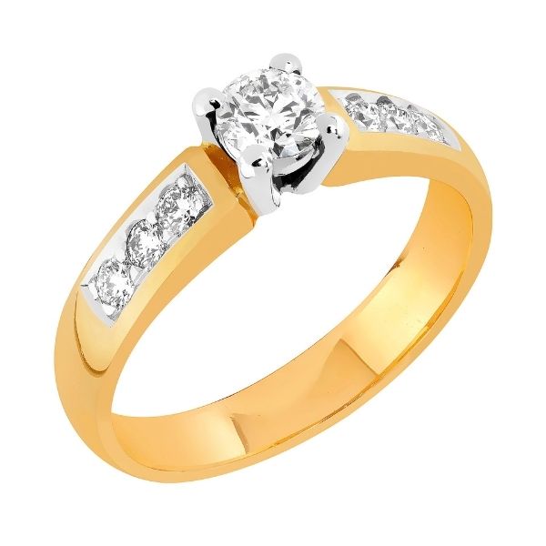 18 tai 14 karaatin keltakullasta valmistettu timanttisormus. Tämän keltakultaisen sormuksen tasaleveän rungon leveys on noin 4 mm ja rungon profiili on tynnyri.