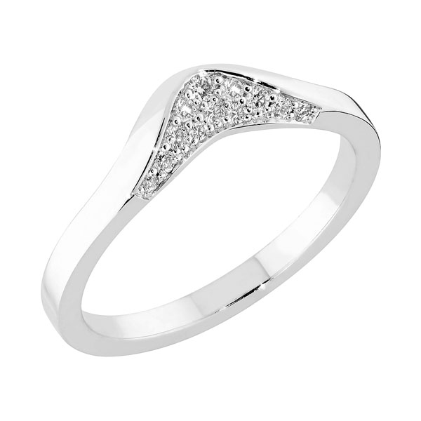 Joenmutka M-312w sormuksen sulava muoto ja pave-istutetut timantit muodostavat kauniin kehyksen 1-kiviselle tai halo-sormukselle. Sormuksen flakkaprofiilisen rungon leveys on noin 2 mm.