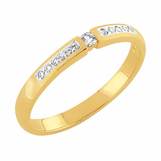 Keltakullasta valmistettu timanttisormus. Kauniin sivukivellisen sormuksen rungon leveys on noin 2,3 mm ja rungon profiili on tynnyri. Sormukseen on istutettu 11 säihkyvää timanttia, jotka ovat yhteispainoltaan 0,10 ct. Sormuksen kullan pitoisuus on valittavissa 14 ja 18 karaatin väliltä.