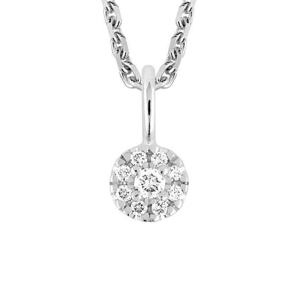 Sandberg Toivomuslähde haloriipus. Tässä säkenöivässä timanttiriipuksessa keskimmäistä timanttia ympäröivät kahdeksan pienempää timanttia ympyrän muodossa. Siron riipuksen koko on 5,1 mm. Timanttien yhteispaino on 0,07 ct ja laatu G-vs. Riipuksen materiaali on laadukas 14 karaatin valkokulta. Tuote ei sisällä ketjua.