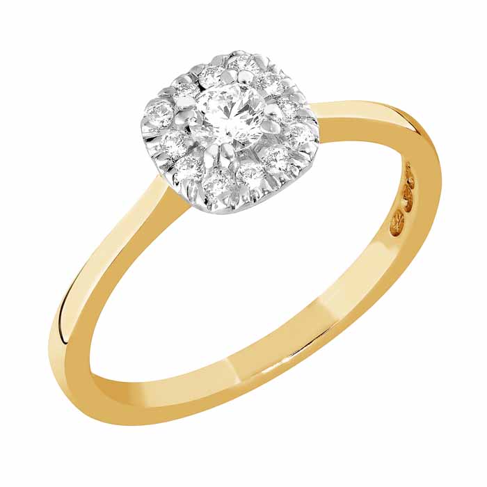 Toivomuslähde V-707yw sormuksen keskitimanttina on 0,15 ct briljanttihiontainen timantti. Keltakultainen runko on valmistettu korkealaatuisesta 18 karaatin keltakullasta. Halokoristetta kohti kapenevan rungon leveys on sivuilla noin 1,8 mm. Halokoristeen alla on riittävästi tilaa vierussormukselle. V-707yw sopii kauniisti yhteen esim. Toivomuslähde rivisormusten V-720w ja V-760w sekä Aamurusko-kihlojen E-110w, E-120w ja E-150w kanssa.
