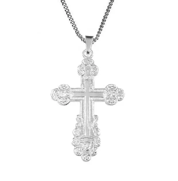 Koristeellinen hopeinen ortodoksiristi. Ristin mitat on 14 x 22,5 mm ja riipuksessa on säädettävä 42/45 cm pitkä ketju. Suosittu lahja kristinoppileirin käyneelle!