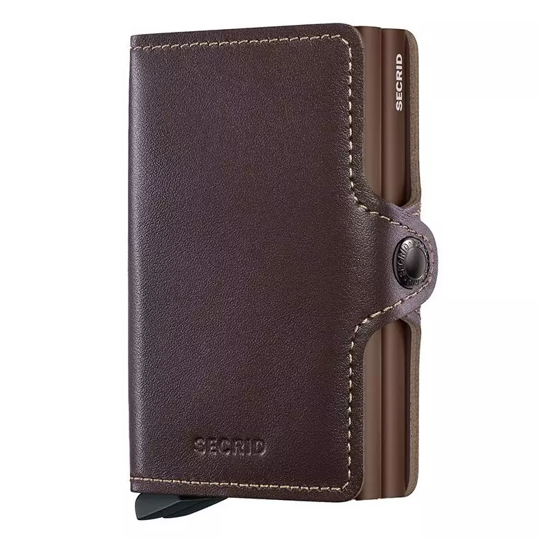 Suklaanruskea nahkainen turvalompakko. Korttikotelo on etälukusuojattu ja sen sisälle mahtuu 8-12 korttia. Sulava korttien nostomekanismi nostaa kortit porrastetusti esiin lompakosta napin painalluksella. Alumiinikuori suojaa lisäksi kortteja taipumiselta. Lisätilaa löytyy nahkakansista seteleille, kuiteille ja käyntikorteille.