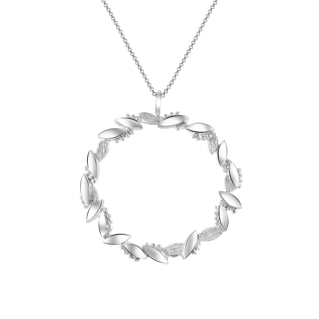 Näyttävä naisten hopeariipus. Seppele riipus on saanut inspiraationsa nimensä mukaisesti kauniista useista lehdistä muodostuvasta seppeleestä. 925 hopeasta valmistetun korun koruosan halkaisija on 5 cm ja korua on saatavilla usealla eri pituisella ketjulla. Seppele koruissa on useita erilaisia pintoja, jotka luovat kauniita kontrasteja. Yhdistele koru muiden sarjaan kuuluvien korujen kanssa luodaksesi harmonisen ja kauniin kokonaisuuden!