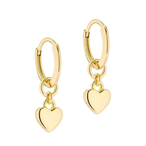 Naisten Ted Baker Harrye korvarenkaat arvokkaassa kullan sävyssä. Korvarenkaista roikkuvat sydämen muotoiset koruosat. Korvarenkaissa on kätevä saranakiinnitys ja niiden koko on 2 cm.