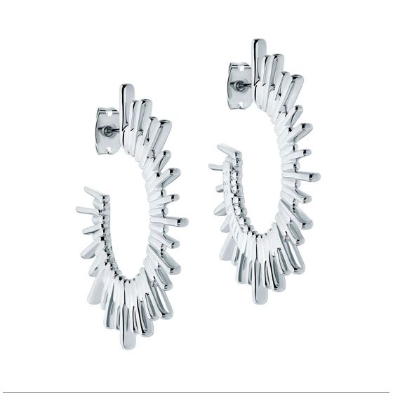 Naisten Ted Baker korvarenkaat hopean sävyssä. Korvarenkaiden muotoilu muistuttaa kauniita auringon säteitä. Korvarenkaissa on tukeva ja luotettava tappikiinnitys.