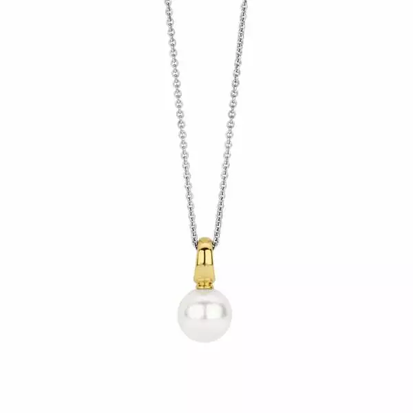 Naisten kullattu kaulakoru valkoisella synteettisellä helmellä. Hopeaketjun pituus on 45 cm. Helmi on kooltaan 10 mm. Materiaali on laadukas 925 sterling-hopea.