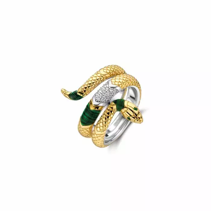 Naisten trendikäs hopeinen käärmesormus kirkkailla sekä vihreillä zirkonia-korukivillä ja keltakultauksella. Sormuksen rungon leveys on 9 mm. Materiaali on laadukas 925 sterling-hopea. Näyttävä Ti Sento sormus arkeen tai juhlaan!