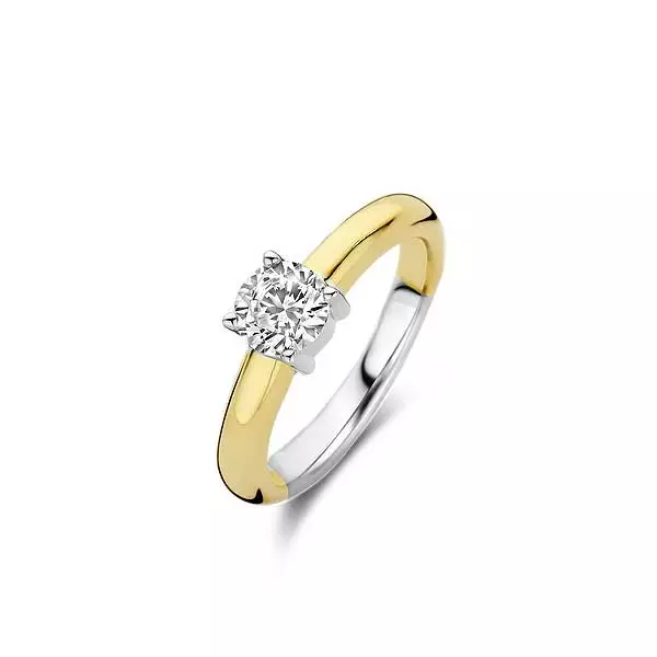 Naisten yksikivinen hopeinen sormus kirkkaalla zirkonia-korukivellä ja keltakultauksella. Sormuksen rungon leveys on 3 mm. Materiaali on laadukas 925 sterling-hopea. Kaunis Ti Sento sormus arkeen tai juhlaan!