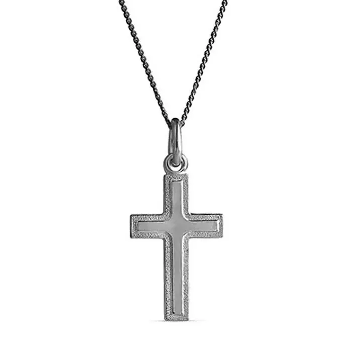 Tummennettu hopeinen ristiriipus mattapintaisilla reunakuvioilla. Hopearistin korkeus on 19 mm ja leveys on 10 mm. Hopearistin ketju on kätevästi säädettävissä pituuksiin 45 cm ja 50 cm. Materiaali on laadukas 925 sterling-hopea, joka on tummennettu.