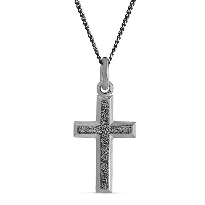Tummennettu hopeinen ristiriipus tyylikkään rosoisesti kuvioidulla keskustalla. Hopearistin korkeus on 23 mm ja leveys on 13 mm. Hopearistin ketju on kätevästi säädettävissä pituuksiin 45 cm ja 50 cm. Materiaali on laadukas 925 sterling-hopea, joka on tummennettu.