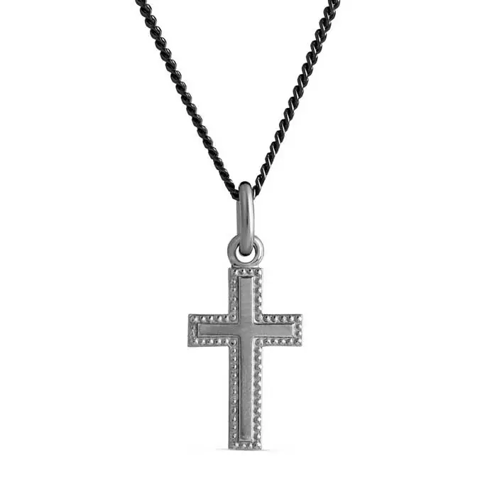 Tummennettu hopeinen ristiriipus koristeellisella reunakuvioinnilla. Hopearistin korkeus on 19 mm ja leveys on 10 mm. Hopearistin ketju on kätevästi säädettävissä pituuksiin 45 cm ja 50 cm. Materiaali on laadukas 925 sterling-hopea, joka on tummennettu.
