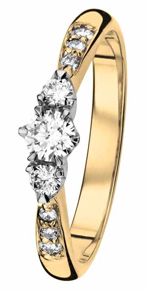 Keltakultainen timanttisormus. Tämä Helene timanttisormus on valmistettu laadukkaasta 14 karaatin keltakullasta. Sormuksessa on 2,8 mm leveä tynnyriprofiilinen runko, johon on raeistutettu 6 x 0,01 ct timanttia. Sormuksen keskellä on kruunuistutettu 1 x 0,14 ct sekä 2 x 0,05 ct timanttia, joilla on merkitys. Helene-korujen kolme keskustimanttia symboloivat rakastavaisten yhteistä menneisyyttä, tulevaisuutta ja tätä hetkeä. Timanttien yhteispaino on 0,31 ct. Sormuksessa on tilaa enintään 20 merkin kaiverrukselle.